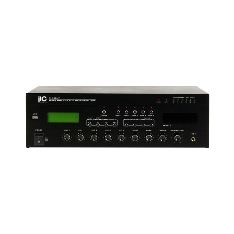 ITC TI-120MT - 5-ти зонный микширующий усилитель мощности через который осуществляется трансмиссия к пяти потокам аудиосистемы.Панель управления имеет встроенный проигрыватель компакт-дисков, который считывает файлы MP3, а также тюнер AM / FM с пультом отдалённого управления и программирования. Радио тюнер позволяет программировать в ручном или автоматическом режиме до 100 радиостанций. MP3-плеер читает из памяти файлы до 1 Гб, второй, построенный порт, позволяет расширить память.
