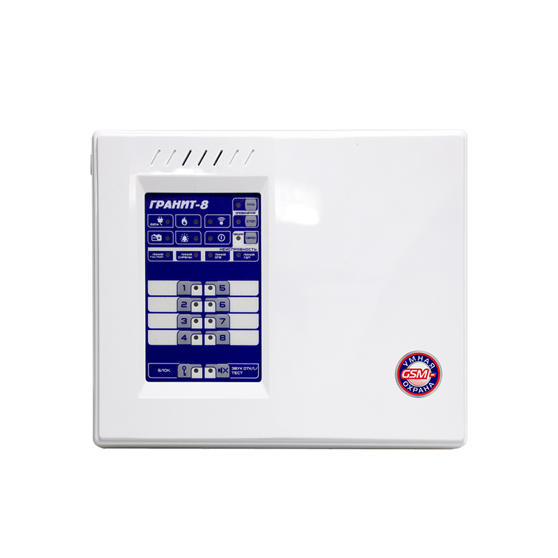 Прибор приёмно-контрольный и управления охранно-пожарный Гранит-8А GSM предназначены для охраны различных объектов, оборудованных электроконтактными и токопотребляющими охранными и пожарными извещателями и передачи информации о тревожных и прочих событиях на телефоны оповещения через каналы связи GSM. Имеет 8 шлейфов сигнализации для подключения пожарных и/или охранных извещателей.Особенности