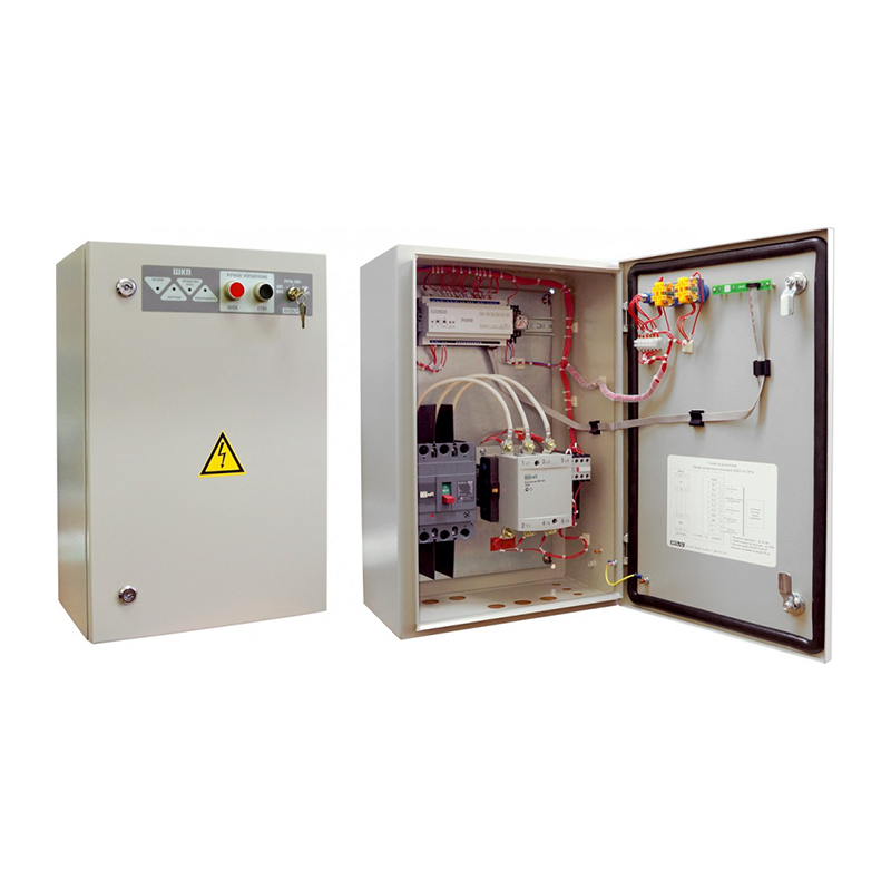 - Возможность работы в режимах ручного и автоматического управления. В автоматическом режиме шкаф управляется подачей напряжения 24 В внешними цепями